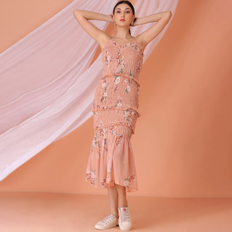 Printed Ready to Wear Halter Neck Smocked Lehenga & Blouse With Dupatta